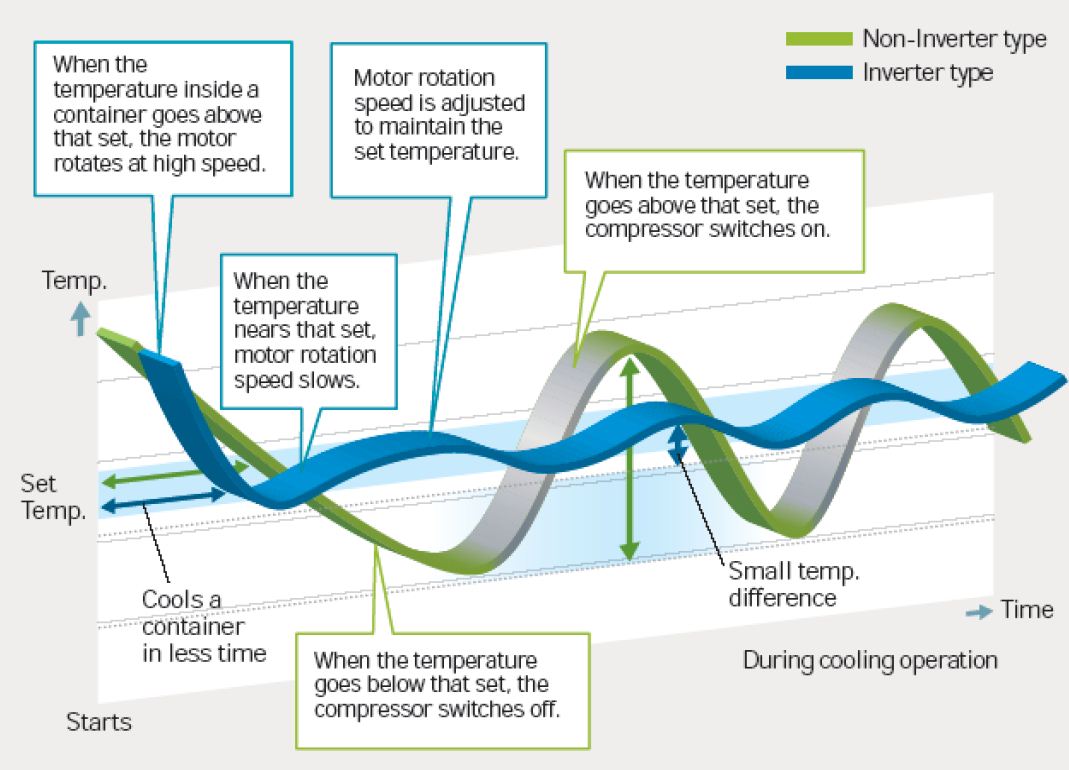 Há também uma tecnologia bem melhor do que uso de soft-starter! É aquela em que a temperatura interna mantém fixa, mas o compressor varia a velocidade, visando a manutenção da temperatura. E obviamente, o compressor parte bem suave. Chama-se Inverter e tanto a partida quanto a operação é controlada, a partir de inversores de frequência (embora muitos motores de compressor são DC Brushless, ou sem escova).