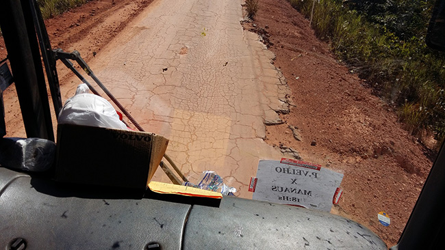 Aí a vaca torce o rabo! Quase quatrocentos quilômetros só de chão e floresta. De uma até 10 horas da manhã só chão. Muitas partes deficientes, algumas  crateras (nada que assuste nem tome o carro) e partes conservadas ou refeitas, mas asfalto só o resto do antigo, de 40 anos atrás será que colocavam asfalto que prestava? Dura até hoje mesmo um tanto quebrado). A poeira, tão aguardada, na verdade quase nem se sente. A não ser quando o ônibus se aproximava de algum carro a frente que se sentia a poeir invadir o veículo, e então se fechava as janelas. De vez em quando alguém ia até o motorista pedir que parasse para atender ao chamado da natureza. E um monte de gente descia ao som do aviso do motorista da hora: “homens na frente e mulheres atrás do carro”. E lá iam todos exercer seu direito de realizar suas necessidades fisiológicas.