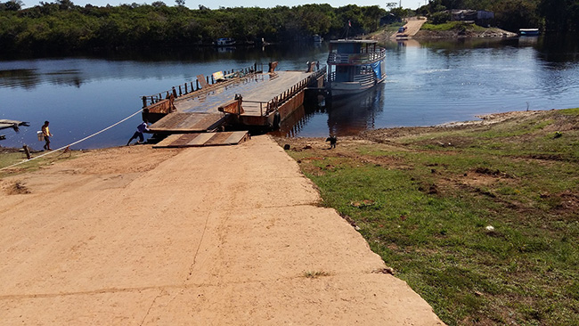 10 da manhã, a primeira balsa. Uma vila com poucas casas, restaurante que não cheguei a entrar e a travessia do Igapó-Açú. Para melhor entendimento, é bom saber que igapó é uma região da mata quando é invadida pelo cheia do rio, e açú significa “grande”. Assim, o nome daquele rio possivelmente se deve ao fato do rio grande parte das terras com matas às margens do mesmo. Com promessas de almoçar uns 140 quilômetros adiante, embarcamos mesmo sem comer nada desde a noite anterior.