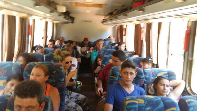 Despedidas; empurração de malas e caixas (muitas envoltas em plástico preto, para não entrar poeira) no porta bagagens;  pressa de entrar no veículo (como se o carro partisse deixando alguém esperando para entrar). Lá dentro a busca pelo número da cadeira. Com todo o controle existente, ainda dois passageiros embarcaram sem ter a poltrona confirmada (overboking rodoviário?). Para alegria de todos faltaram exatamente 2 passageiros e todos puderam ser acomodados.